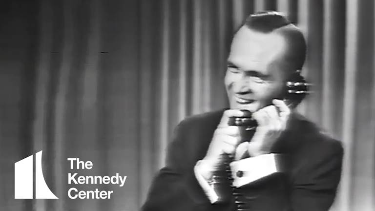 Comedic legend Bob Newhart performs for Presidents John F. Kennedy and Dwight D. Eisenhower during “An American Pageant of the Arts,” on November 29, 1962.