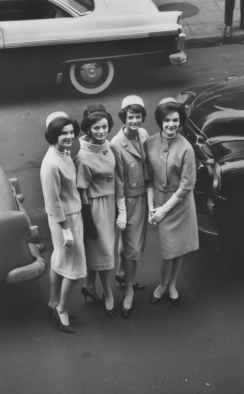 Women wearing Oleg Cassini suits and pillbox hats like Mrs. Kennedy, 1961.