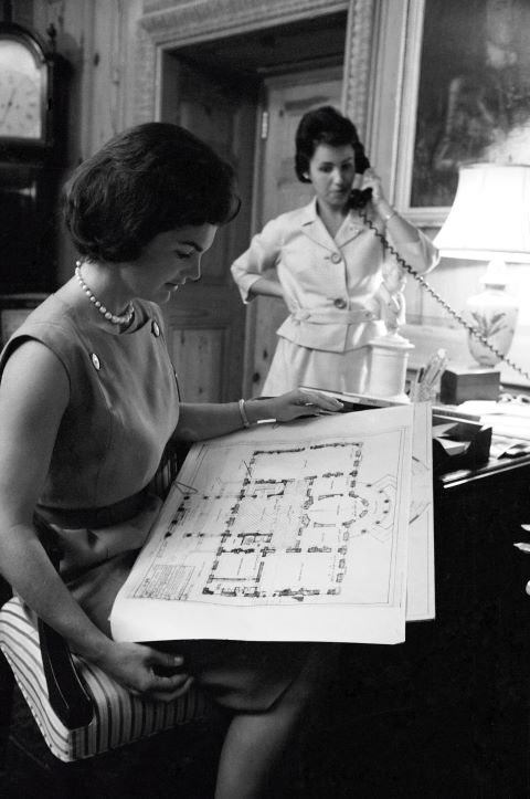 Mrs. Kennedy and curator Lorraine Pearce at work on the White House restoration, July 1961.