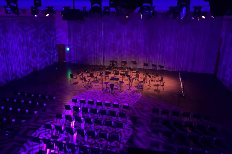 The largest multi-purpose room with a viewing balcony containing loose seating, to allow for observation. The space can be used for a variety of events, performances, rehearsals, and conference style theater or break out sessions. The space can be made dark with the use of curtains located on all four walls, including a permanent lighting, audio, and video system. The distinctive cerulean blue stained concrete ceiling, acoustic crinkle natural grey concrete walls, and dark stained wooden floor provide a space that can be transformed and used for any occasion.